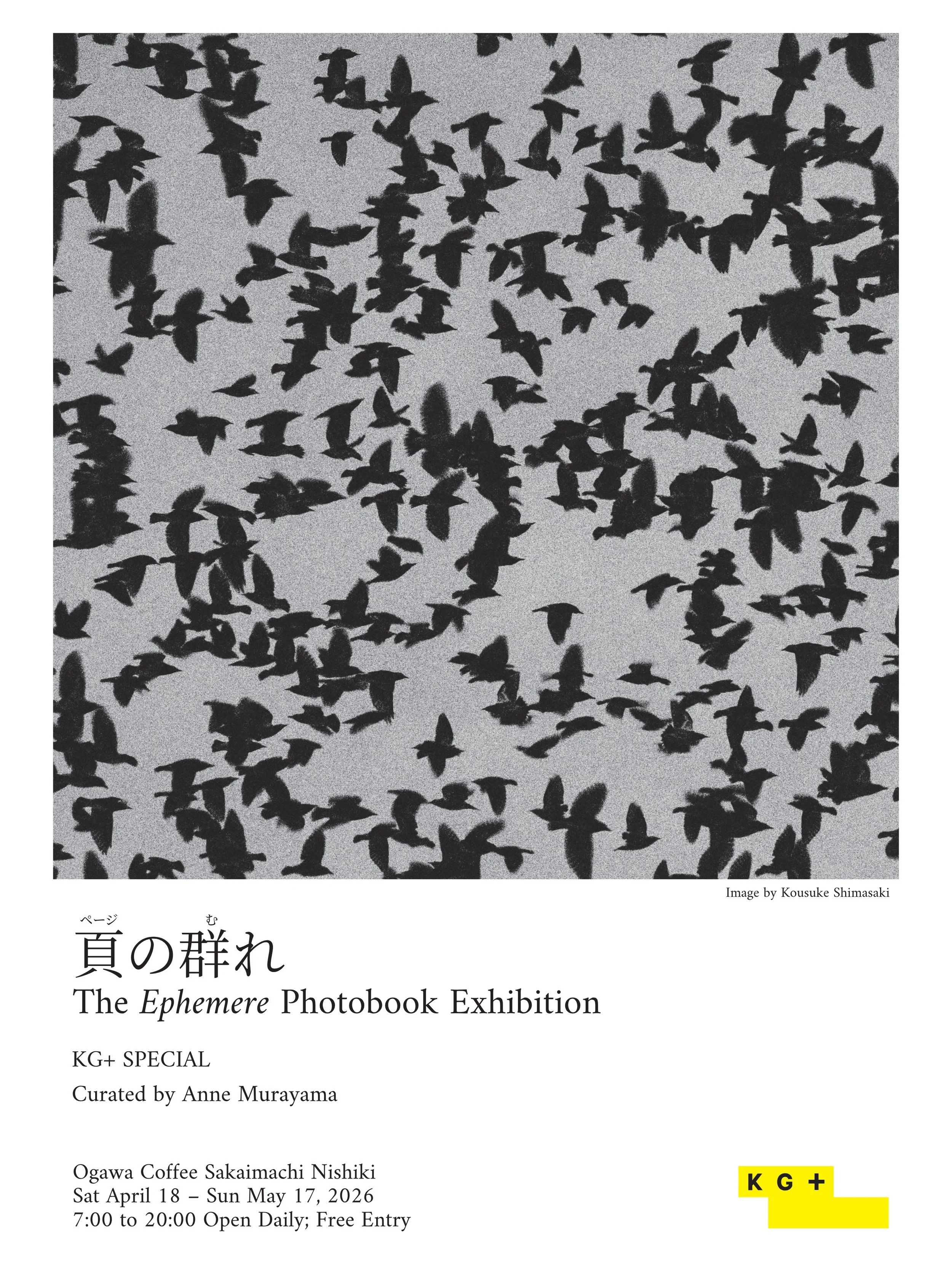 Back to All Events 「頁の群れ」 The Ephemere Photobook Exhibition Saturday, April 18, 2026 7:00 AM Sunday, May 17, 2026 8:00 PM Ogawa Coffee Sakaimachi Nishikiten (map) Google Calendar ICS Read more: 🔗 KG+ Website ( Japanese • English )📌 Short Programs